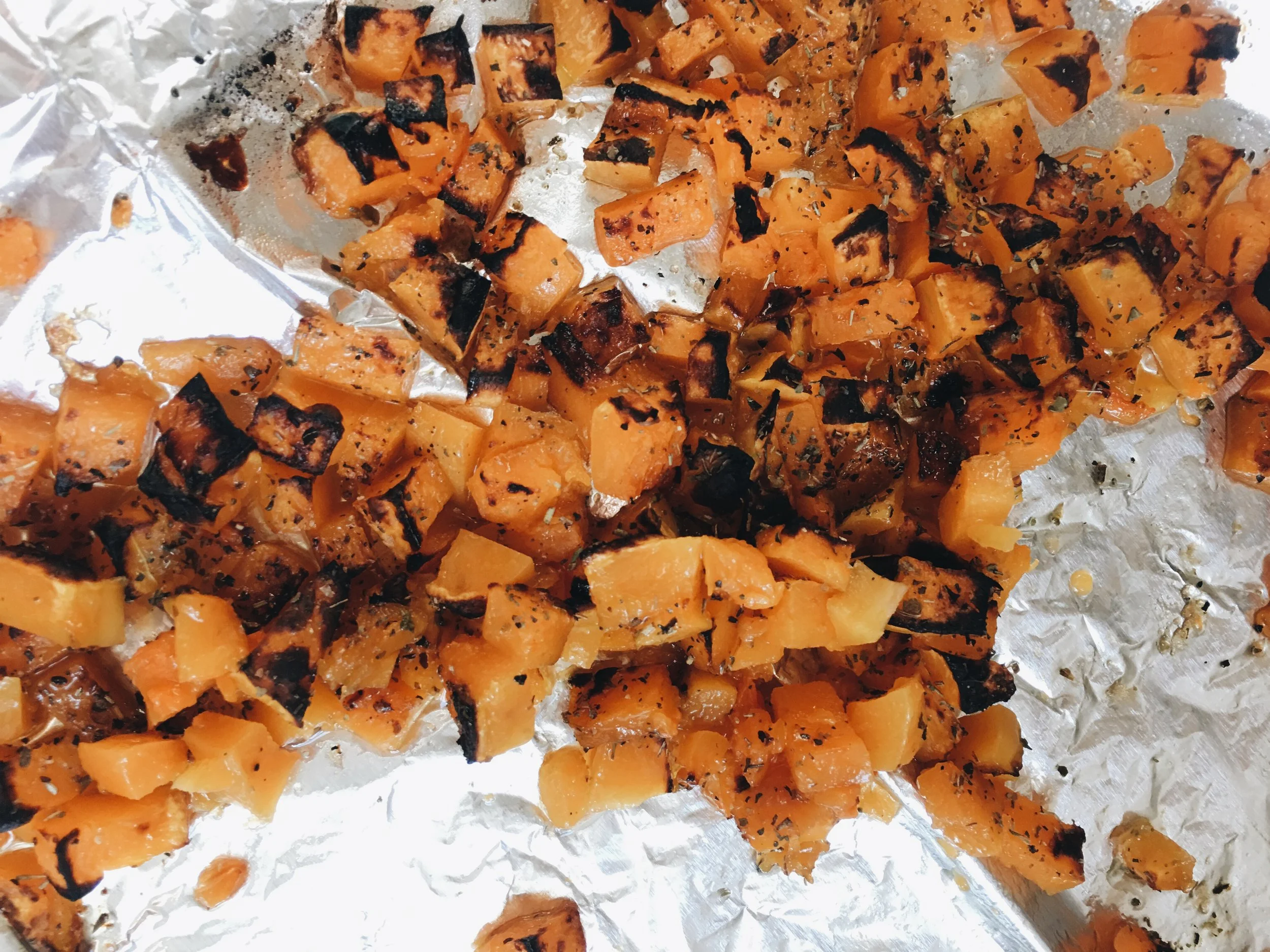 Part 1: butternut squash: once peeled and cubed, boil it all. until it’s just slightly soft (don’t overdo it). Once soft, lay the cubes out of a roasting pan and sprinkle with ¼ cup of olive oil, 1 tbsp of brown sugar, salt, pepper and Italian seasoning to taste. Broil until the cubes are your desired toastiness. Let cool.